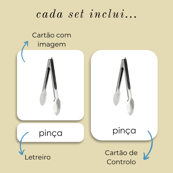 Este conjunto de Cartões de Nomenclatura (Cartões de 3 Partes) Utensílios de Cozinha incluí 24 cartões: